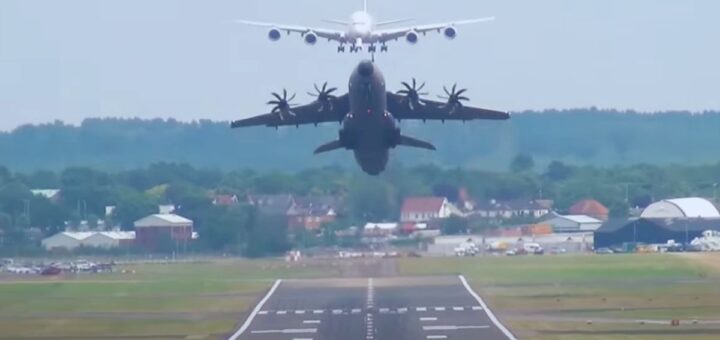 Impressionante manobra de Airbus A400M Atlas a levantar voo antes de A380 aterrar