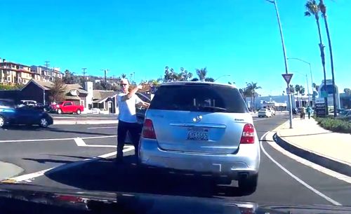 O condutor saiu para brigar mas não travou bem o carro e o carro começou a andar sozinho. É caso para dizer que teve o que mereceu, não percebemos bem quem tem razão na...