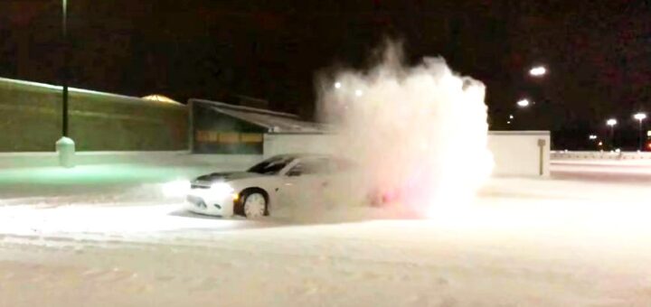 Uma boa dose do entusiasmo da dupla (piloto e neve) está associada a um terceiro elemento indispensável à diversão: o Dodge Charger Hellcat