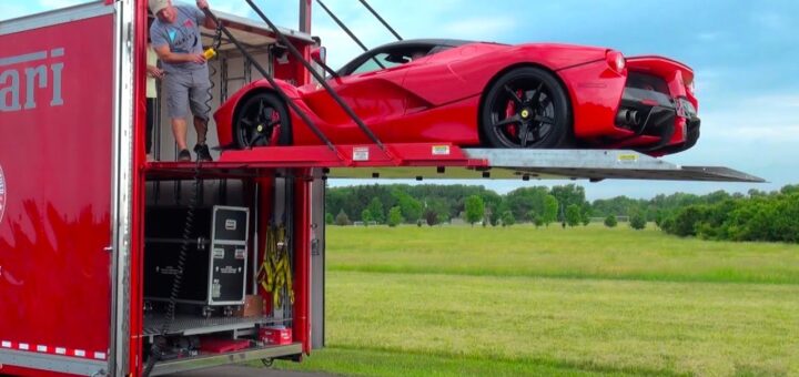 Além do Ferrari em si, repare no camião – também ele personalizado e estiloso – destacado para realizar o procedimento!